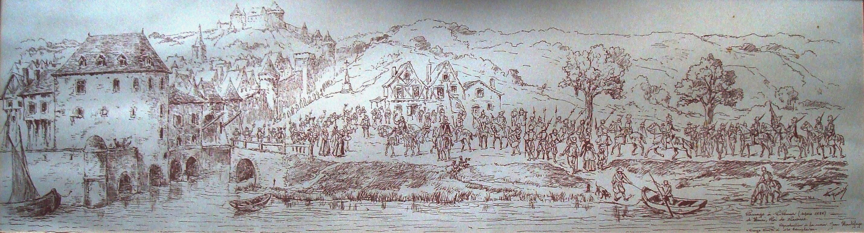 Succédant à sa mère Jeanne d’Albret, Henri de Navarre devient le nouveau vicomte de Villemur, dont le gouverneur est le protestant Antoine de Latour de Reyniès. Le futur roi de France Henri IV fera d’ailleurs en 1585, plusieurs séjours dans nos murs, reçu comme il se doit part les autorités de la ville. Villemur vivra alors au rythme des événements tragiques suscités par les Guerres de Religion qui se sont poursuivies tout au long du XVIe siècle. En 1592, Villemur est le théâtre d’une des batailles mettant aux prises les ligueurs ou catholiques et les protestants, affrontement dans lequel le chef de la Ligue catholique, Antoine Scipion de Joyeuse, trouvera la mort, noyé dans le Tarn.