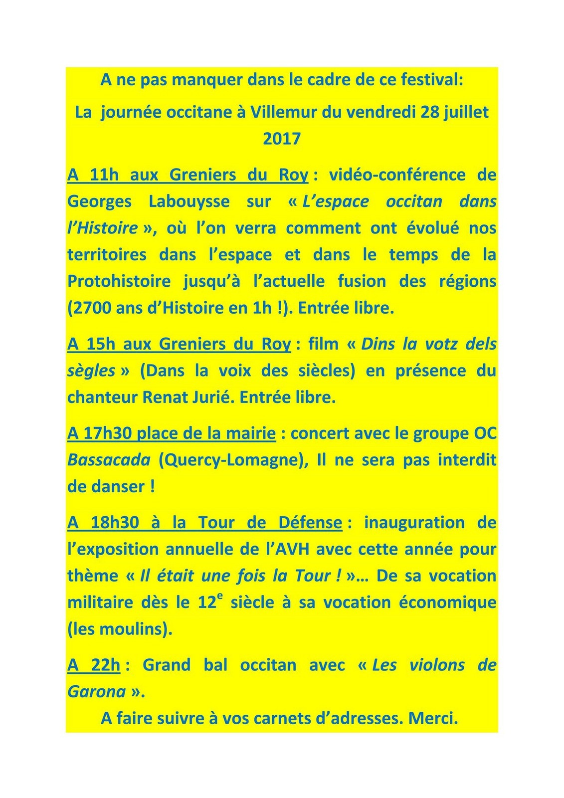 L’aventure «World Music» commence cette année, avec pour objectif de marquer tous les ans, à Villemur-sur-Tarn, le début de la saison des festivals. Mais ce festival n’est pas que musical, il doit permettre de faire se rencontrer les publics et les acteurs locaux : brasseries, restaurants, commerçants et artisans qui sont les forces vives de la commune. » ( extrait de l’article paru dans » La Dépêche du Midi « « du 13 / 3 / 2017)