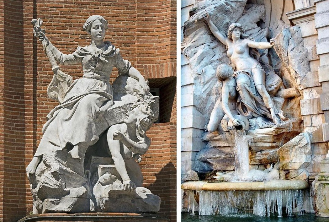 à dr : l’Ariège et la Garonne, place Lafourcade à Toulouse, sculpture d’A- Laborde (1896).