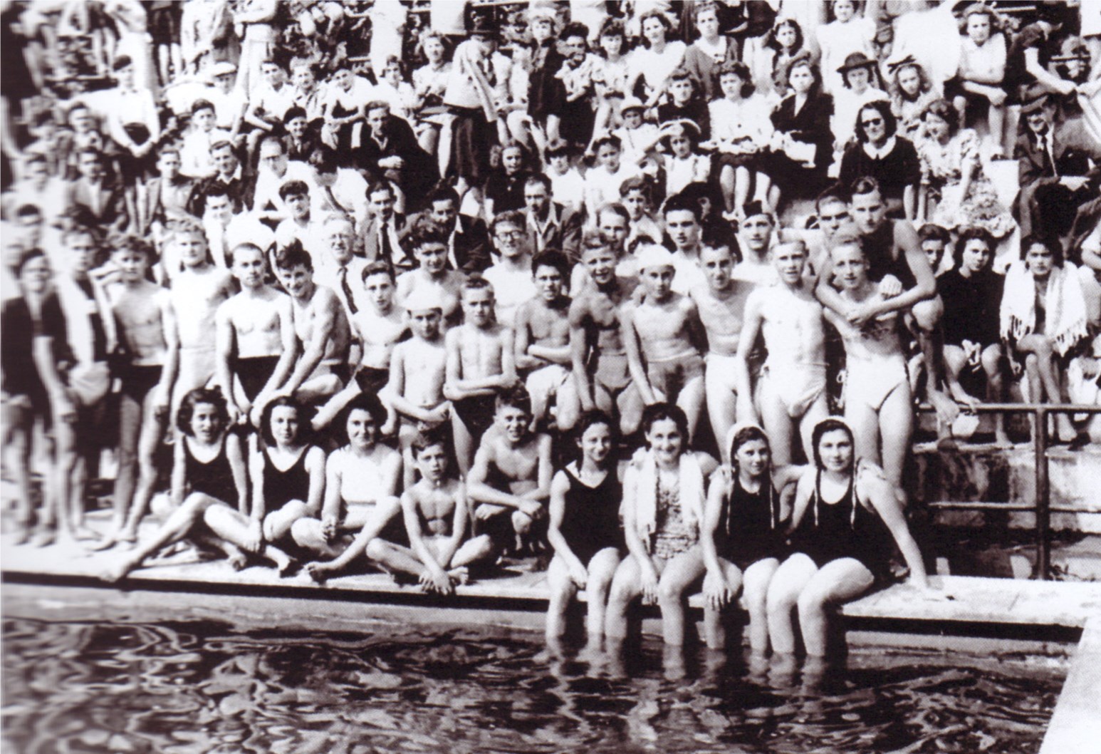 Léon Bégué nous a aimablement prêté une photo prise lors d’une compétition en été 1943. Les baigneurs photographiés nageaient dans le Tarn mais ont utilisé également le grand bassin. Certains n’ont pu être identifiés, si vous reconnaissez une silhouette, soyez aimable de contacter l’équipe de l’AVH dont les coordonnées figurent sur le site. ( voir : L’association Bureau) Par avance, merci.