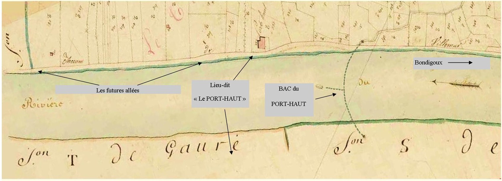 Au bout des Allées actuelles se trouvait le Port-Haut (Le lieu-dit Port-Haut a son pendant sur la rive gauche) c’est près de là qu’était situé un des deux bacs reliant les deux rives. (2) Le plan napoléonien de 1812 ne fait figurer qu’une seule construction (La maison Ratier ?) sur la rive droite en bordure des allées, celle du Port-Haut. Le bac appartenait à la communauté, son rôle était primordial pour le passage des troupes d’une rive à l’autre, la « route » menant à Toulouse débouchait à cet endroit-là sur la rive gauche.