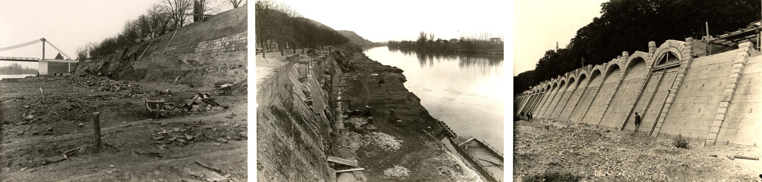 Il faut de toute urgence rebâtir un mur de soutènement pour éviter le pire à la prochaine crue. Ce sera chose faite au bout de 3 ans de travaux colossaux : le mur de soutènement en béton et pierres de taille comporte 111 arches sur une longueur de 700 mètres. En amont du pont, de magnifiques escaliers remplacent le plan incliné emprunté jadis par les lavandières.