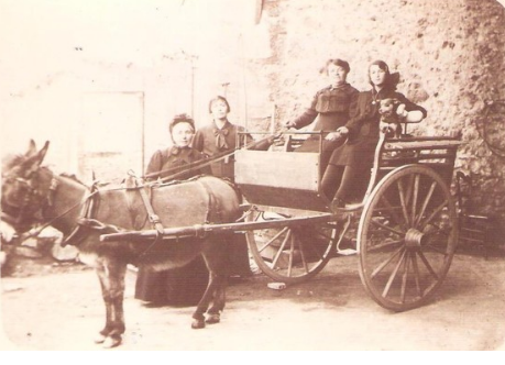 (10) Carriole avec passagers à l’avant et produits agricoles à l’arrière