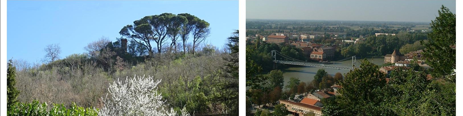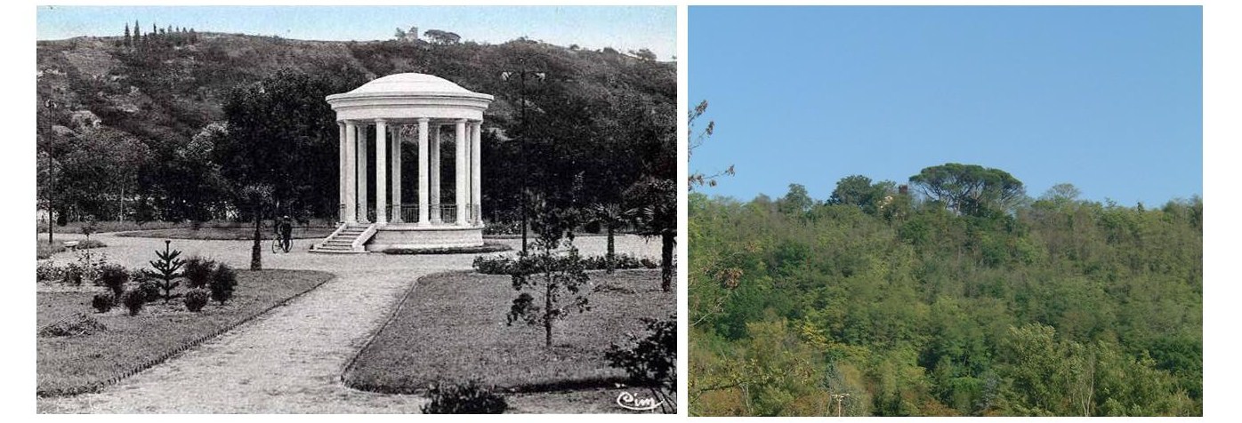 3. Vue du jardin Public, la Tour surplombe le coteau derrière le kiosque. Photo de droite, la végétation a envahi le coteau.