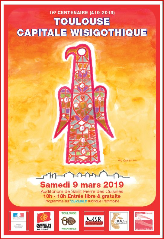 Dans le cadre du XVIe centenaire (419-2019) de Toulouse comme capitale du royaume wisigoth, qui s’étendra à son apogée de la Loire à Gibraltar, une grande journée de conférences se tiendra le 9 mars prochain à l’auditorium de Saint-Pierre-des-Cuisines, dans ce quartier de Toulouse qui fut le centre administratif et politique du pouvoir wisigoth. Vous trouverez en PJ le programme détaillé de cette journée, ainsi que l’affiche qui sera posée sur les abribus et que vous pouvez reproduire pour vos associations.