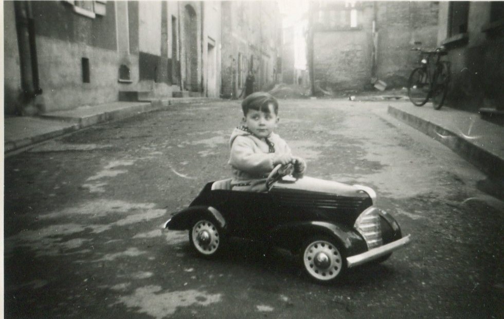 Derrière cet automobiliste intrépide, au fond à droite la maison Montet, à gauche, « la rue torte »