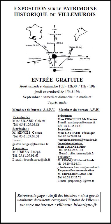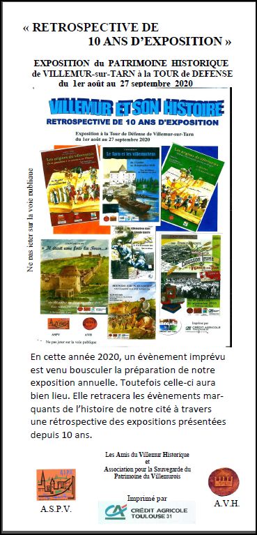 Et puis, après bien d’incertitudes liées à la situation actuelle, la décision a été finalement prise, en accord avec la municipalité de Villemur-sur-Tarn : l’exposition 2020 aura bien lieu. Elle sera consacrée à une rétrospective des expositions de 2009 à 2019. Pour les estivants ce sera l’occasion de découvrir le passé historique de la ville, quand aux autochtones ils reverront sans nul doute avec plaisir, quelques épisodes du passé.