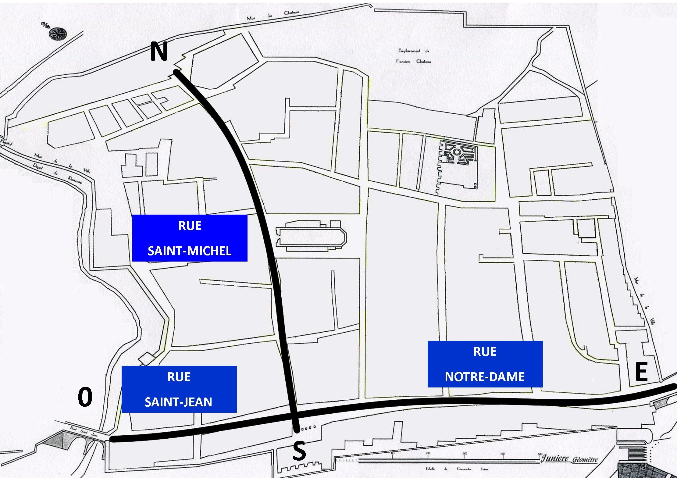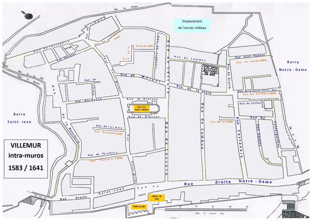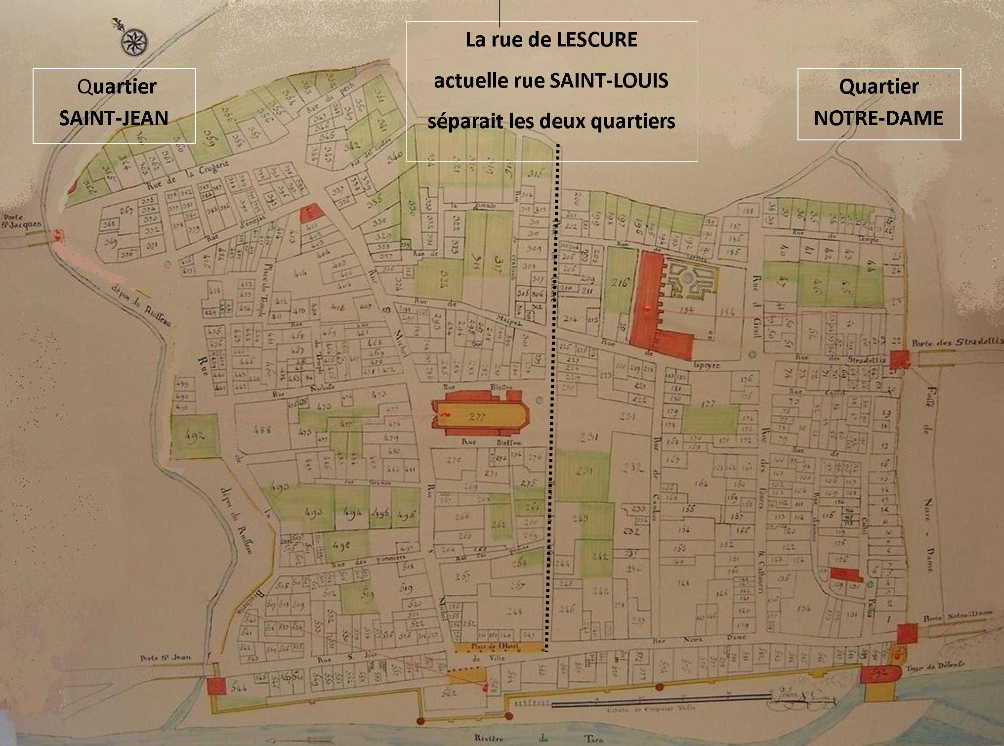 Villemur intra-muros est divisé en ce temps-là en deux quartiers sensiblement de la même grandeur, le quartier Notre-Dame à l’Est et le quartier Saint-Jean à l’Ouest, de part et d’autre de la rue de Lescure, l’actuelle rue Saint-Louis qui sert en quelque sorte de « frontière. »