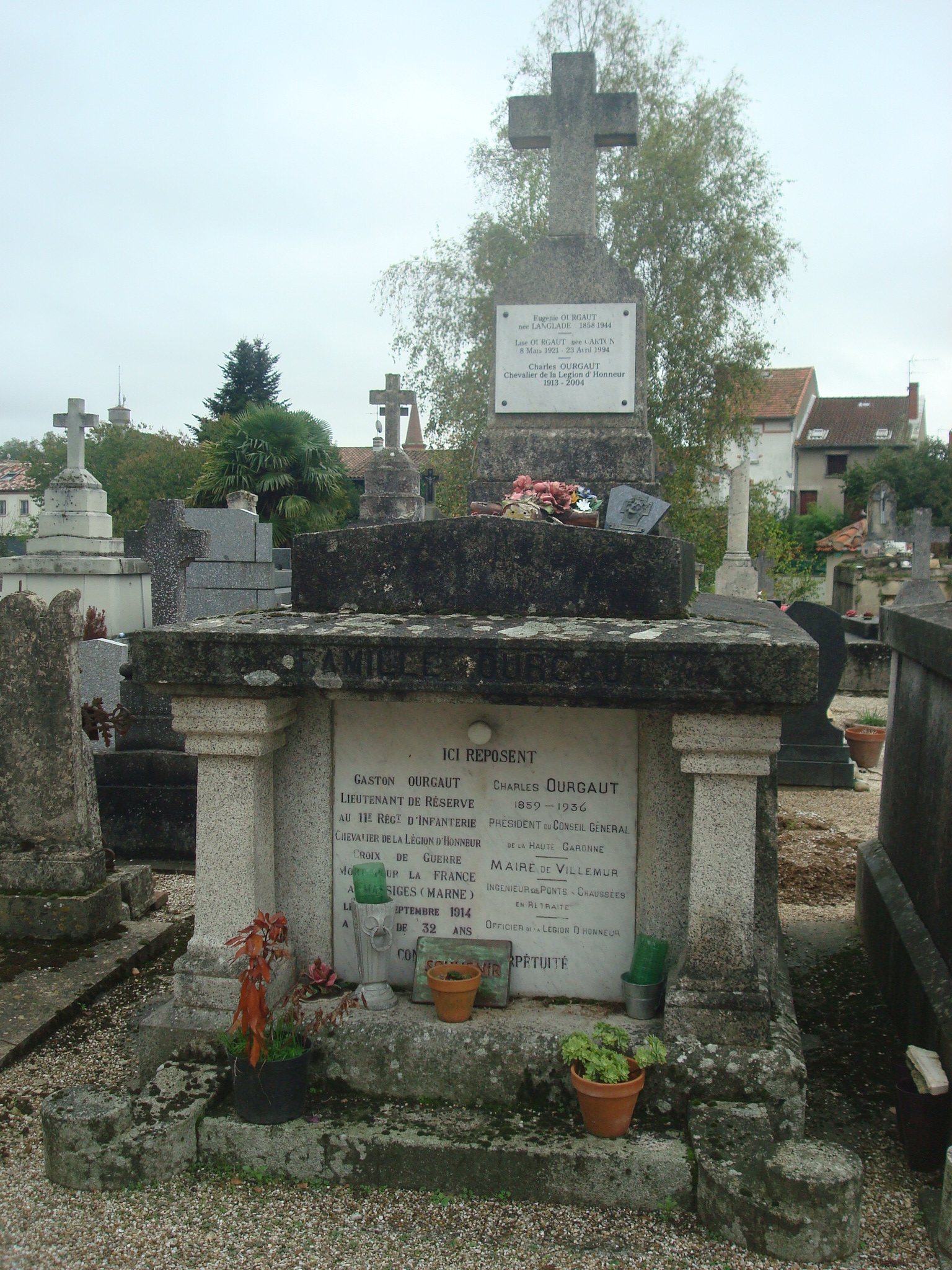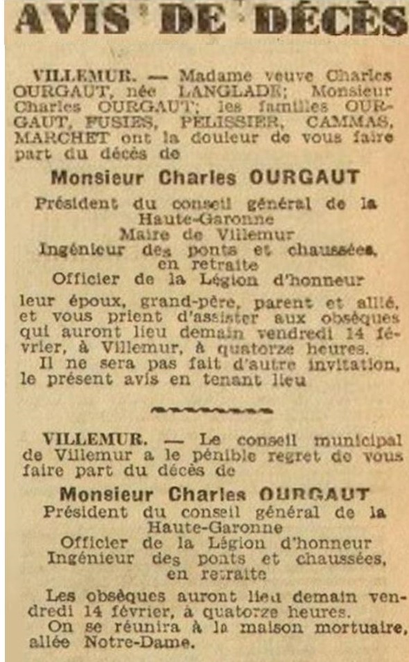 « Une foule recueillie se presse sur les Allées Notre-Dame…La levée du corps a lieu à 14h 30 puis le cortège se forme et se met en marche. Longeant les quais de la rive droite, le cortège s’engage dans la rue de la République. Devant l’Hôtel de Ville dont la construction vient à peine d’être achevée, la halte est émouvante. La sirène d’alarme mugit longuement puis l’Harmonie villemurienne joue une marche funèbre. Le cortège reprend sa marche dans les rues silencieuses fenêtres et portes closes et se dirige vers l’église paroissiale. Après la cérémonie religieuse, le cortège redescend vers l’Hôtel de Ville, et par les quais s’achemine vers le cimetière où défilent une dernière fois les diverses sociétés. Prenaient part au cortège : les enfants des écoles, accompagnés de leurs maîtres et maîtresses, les anciens combattants et mutilés, l’Union Sportive Villemurienne, les sociétés de pécheurs à la ligne et boulistes (avec fanions et drapeaux), la société de secours mutuel des établissements Brusson, et la société de secours mutuel de Villemur (avec leur drap mortuaires), l’Harmonie Villemurienne. Le char funèbre est suivi d’une longue file de gerbes et de couronnes portées à bras. Le deuil est conduit par M. Charles Ourgaut, petit-fils, chef adjoint du cabinet du Préfet, Madame Ourgaut, la famille et les intimes et enfin dans un interminable défilé la population presque entière de la ville. Parmi les très nombreuses personnalités présentes, mentionnons : M. Désiré Barbe, premier adjoint au maire et ses collègues du conseil municipal, M. le préfet Atger, les membres du Conseil Général, le personnel de la Préfecture et des services départementaux, toutes les personnalités venues rendre un dernier et affectueux hommage au regretté défunt…