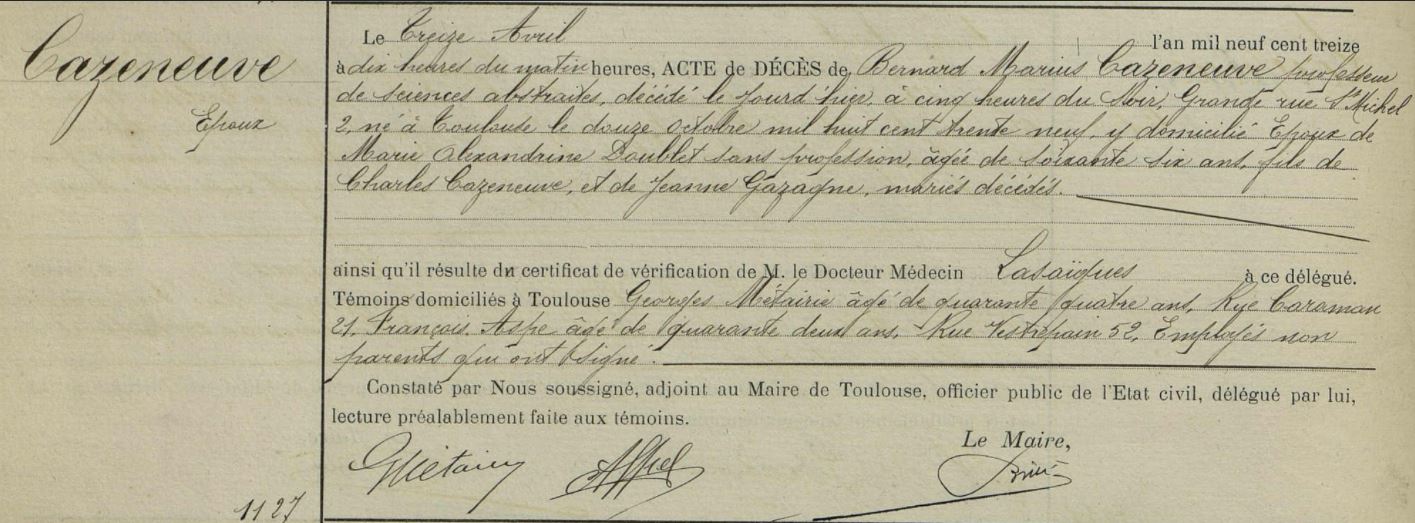 7. Acte de décès de Marius Cazeneuve (AM de Toulouse,1E673 vue 143/273)