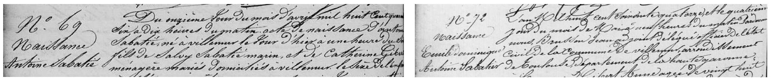 1. Actes de naissance d’Antoine Sabatié et de son fils Emile Sabatier