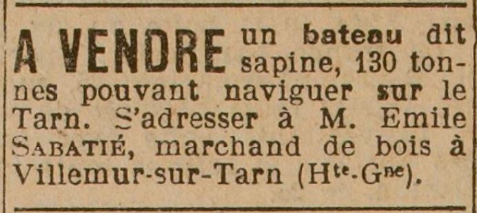 A la même date, son fils Antoine est employé de commerce, puis négociant l’année suivante. Il est enfin marchand de bois en 1874 l’année de naissance d’Emile et du décès de Salvi son père. Malgré tout la famille Sabatié n’a pas rompu sa relation avec la rivière : c’est par elle que se fait encore le transport du bois ; c’est d’ailleurs en 1876 qu’Antoine Sabatié fait construire à Villemur le célèbre bateau « Le Jeune Emile », fleuron de sa flottille.