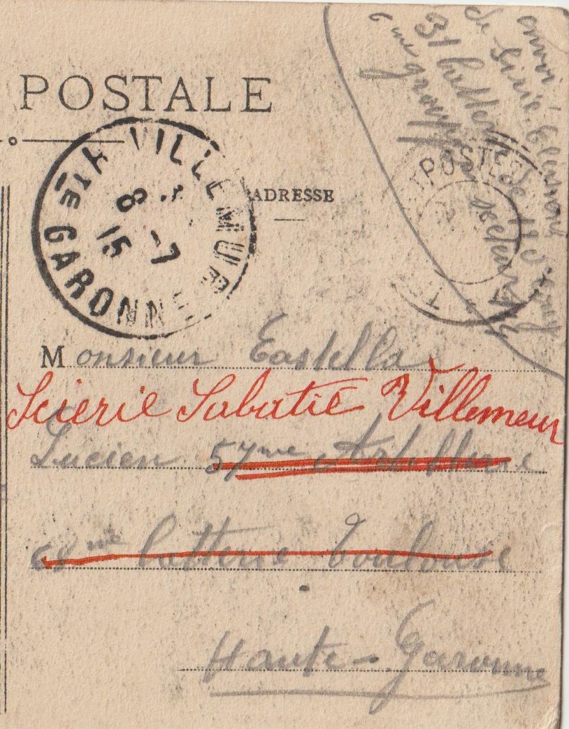 (∗) Clément Sirié et Lucien Castella sont tous deux ouvriers de la scierie et sont incorporés depuis 1914 au 57e Régiment d’Artillerie de Campagne . La carte ci-contre est envoyée le 1er juillet 1915 par Clément Sirié à Lucien Castella . Ce dernier, vient d’être réintégré à la scierie depuis quelques jours. Clément Sirié, encore au front, rejoindra finalement Villemur le 24 août.