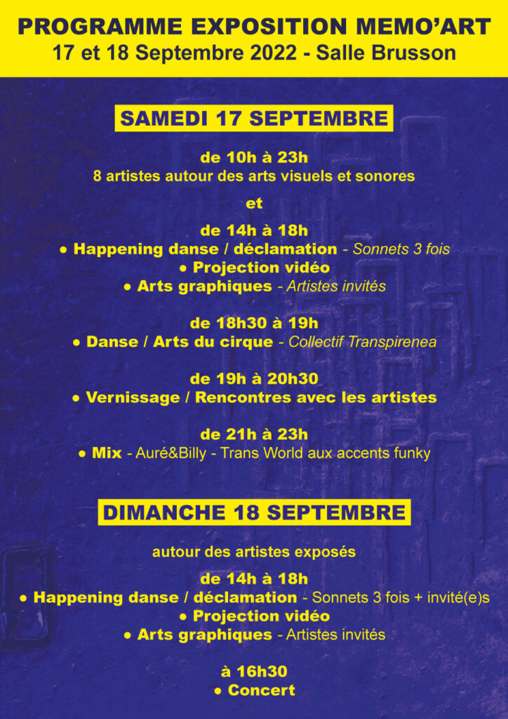 Horaires : samedi 16 et dimanche 17 septembre de 10 h à 12h 30 et de 15 h à 19 h