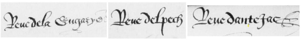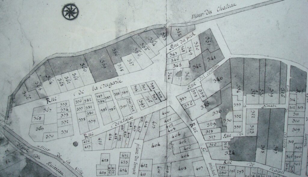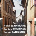 Presque en face de la rue Thémines, voici l’impasse du château d’eau ancienne rue del Coustou. Nous voici arrivés presque au sommet, où la rue Saint-Michel débouche sur l’actuelle rue du Pech : la petite portion de voie côté droit était l’ancienne rue del Pech (plan de 1779) elle ne comptait que quatre maisons en 1583 ; à gauche la longue portion de rue qui redescend s’appelait rue de la Crugarie, l’origine de ce nom nous est inconnue. Nous sommes ici au cœur de ce que l’on appelle « Le Grand Pech »