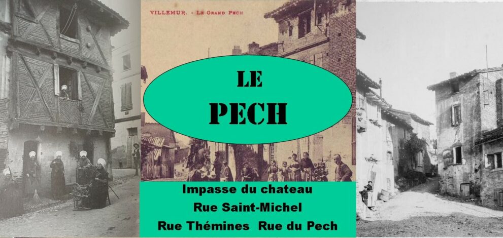 Ce Pech, c’est le Montmartre villemurien ; c’est Villemur qui monte à l’assaut du coteau, aussi quels raidillons ! Une 40 CV s’y époumonerait et s’avouerait vaincue…Montez-y vers quatre heures de l’après-midi, l’été, vous verrez assises sur leur chaise basse, caquetant et tricotant avec ardeur, les matrones imposantes du quartier ; des goûts semblables, des habitudes communes, un travail identique, des liens de parenté unissent étroitement les diverses maisons. Et ces matrones ne sont point coquettes : une chemise de toile, un peignoir ample suffit à leur toilette. Toilette sommaire. Et comme un jour je faisais part de ma surprise à une personne du quartier, elle me répondit en riant : « Se cal pas troupla à Bilomu, sen toutis parents ! » (3)
