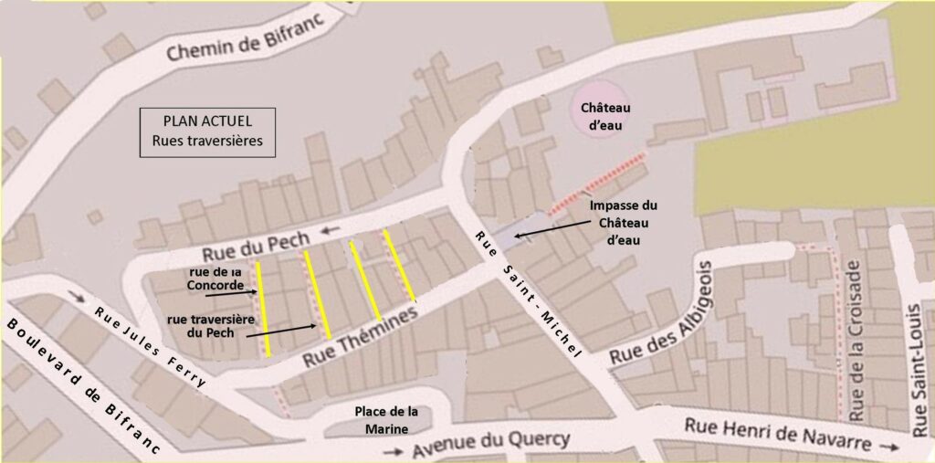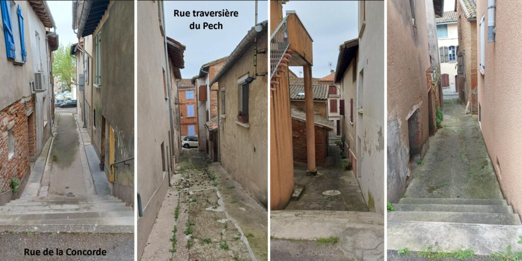 Dans cette partie haute du quartier, l’actuelle rue du Pech et la rue Thémines délimitent un pâté de maisons et sont reliées l’une à l’autre par quatre ruelles de quelques dizaines de mètres de longueur. Ces ruelles sont dites « traversières » que seuls les piétons peuvent emprunter. Deux de ces voies ont pour nom la rue de la Concorde et la rue traversière du Pech.