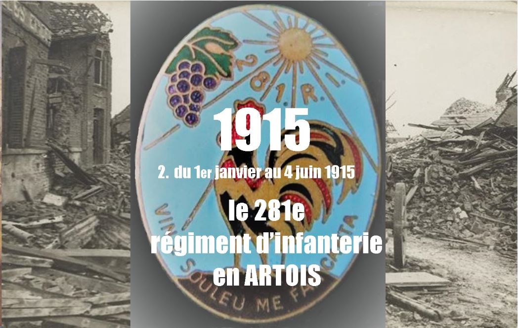 1915 le 281e Régiment d’Infanterie en Artois 2. Du 1er janvier au 4 juin 1915 Pendant la période qui s’étend de janvier aux premiers jours de mai, le 281e R. I. occupe les tranchées qu’il a creusées à cheval sur la route de Béthune à Lens. La position est sans cesse améliorée on creuse toujours …