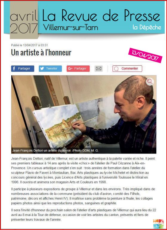 Jean-François Dettori est un proche des Amis du Villemur Historique. Son talent de peintre est mis à contribution, (avec en particulier Gaston Sengès) pour la réalisation des décors lors des expositions que nous organisons, c’est lui qui conçoit l’affiche de ces mêmes expos et la page de couverture de certaines de nos publications.