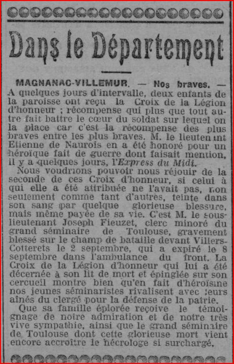 La dernière victime des combats dans l’Aisne est un brillant jeune homme de 27 ans, Joseph Fieuzet. Futur prêtre, il est originaire de Magnanac où son père est menuisier. D’abord incorporé au 11è régiment d’infanterie de Montauban, il gravit les échelons, caporal puis sergent; rentre ensuite dans les troupes coloniales au 3è régiment de Zouaves, où il est sergent-fourrier. Le 18 mai 1918 il est promu lieutenant et intègre le 7è régiment de tirailleurs algériens qui dans l’Aisne, mène une lutte farouche pour tenter d’enfoncer la ligne Hindenburg. Grièvement blessé au combat près de Vauxaillon au nord de Soissons, il est rapatrié à l’arrière et meurt le 8 septembre à l’ambulance de Villers-Cotterêts. Cité à l’ordre de l’Armée et décoré de la croix de guerre, il s’était distingué le 26 septembre 1914 au Mesnil-les-Hurlus dans la Marne. Ce jour-là, alors agent de liaison du Commandant du 11è R.I, il s’était porté en avant, pour ramener dans ses lignes un de ses camarades blessé.