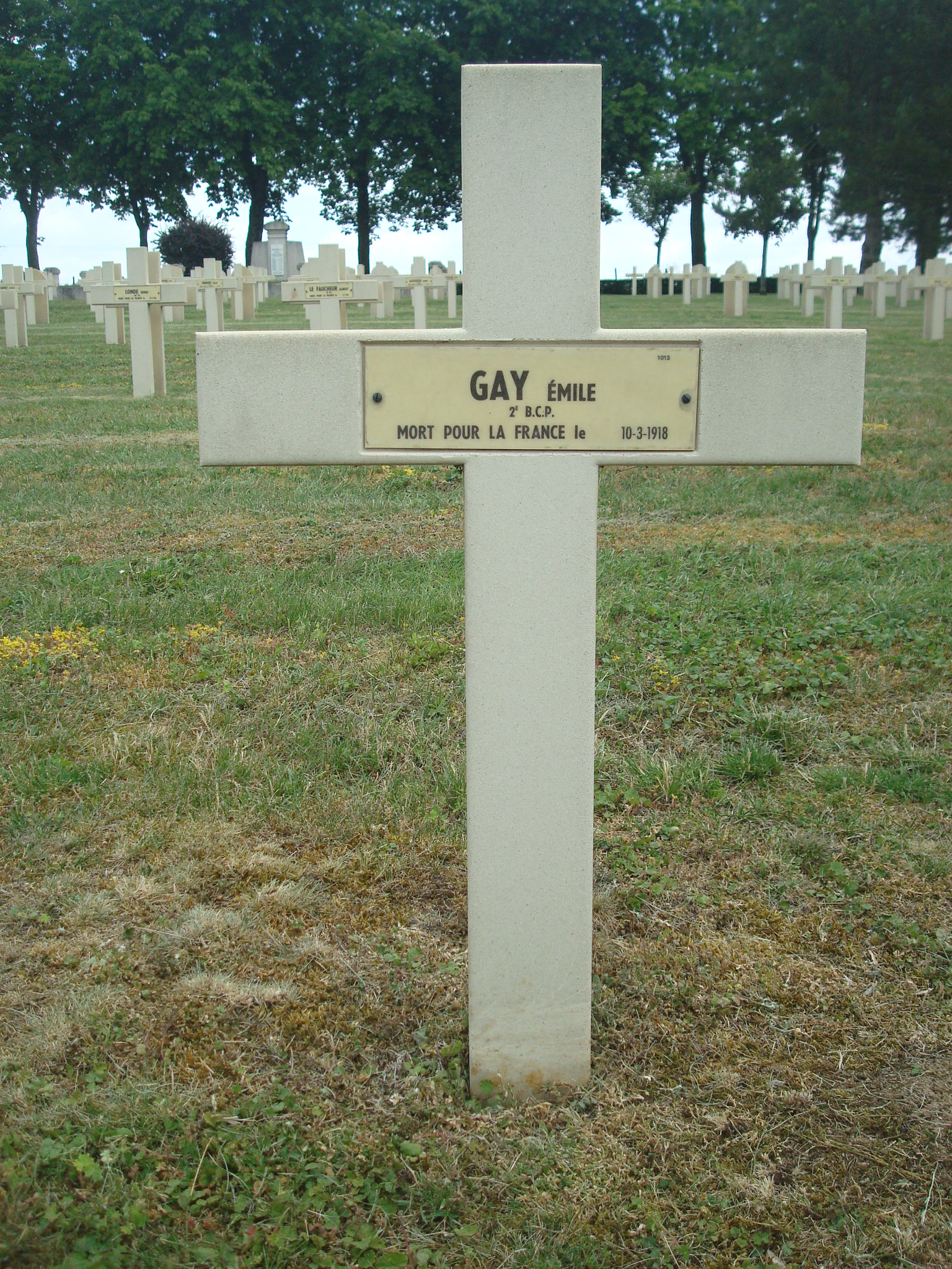 Les hommes du 2è bataillon de chasseurs qui tiennent ce secteur sont exténués par des conditions très défavorables, et en partie intoxiqués par les gaz. Parmi eux, le jeune Emile Gay, d’abord classé dans le service auxiliaire pour « faiblesse », a cependant rejoint les Chasseurs en mai 1917. Le 9 mars 1918, un violent bombardement s’abat sur tout le secteur du bois des Fosses, près de Beaumont au cours duquel Emile Gay est grièvement touché par un éclat d’obus à la cuisse droite. Transporté à l’hôpital d’évacuation n°11 à Fleury-sur-Aire, au sud de Clermont-en-Argonne, il décédera le lendemain soir. Il est inhumé à la nécropole de Rembercourt-aux-Pots dans la Meuse, où son corps a été transféré le 3 mai. Harassés, les hommes du 2è B.C.P tiendront encore 45 jours avant d’être relevés.(2)