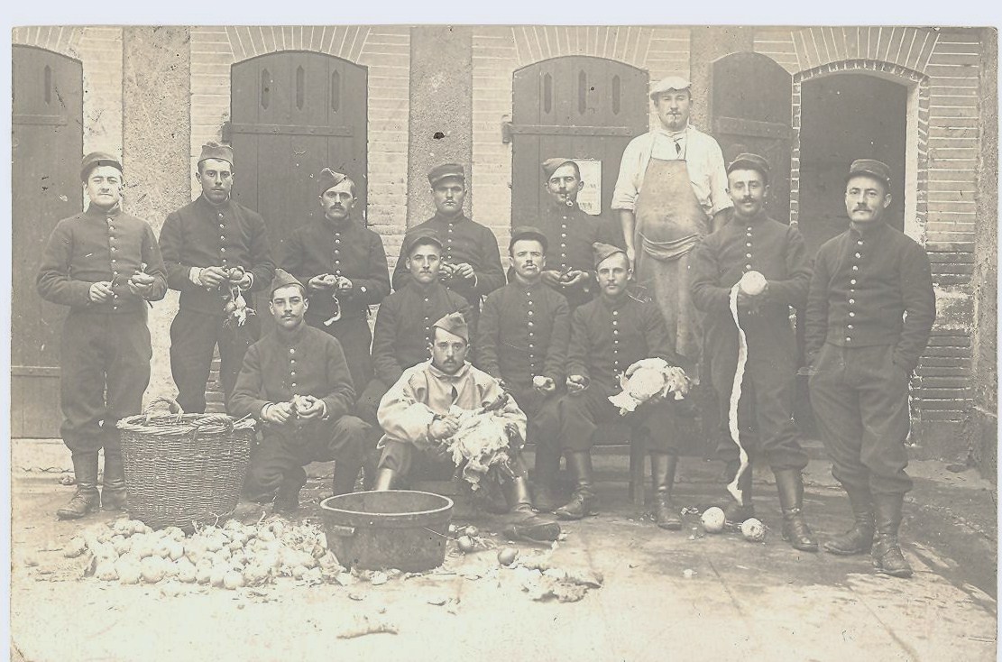 6. Corvée de patates en 1908 au 20e R.I à Montauban (Camille Terrisse assis au centre uniforme clair)