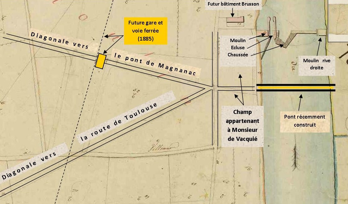 La seconde diagonale (future avenue de la Gare) fera la jonction avec la route de Magnanac et filera vers Grenade, plus tard la départementale n°9.