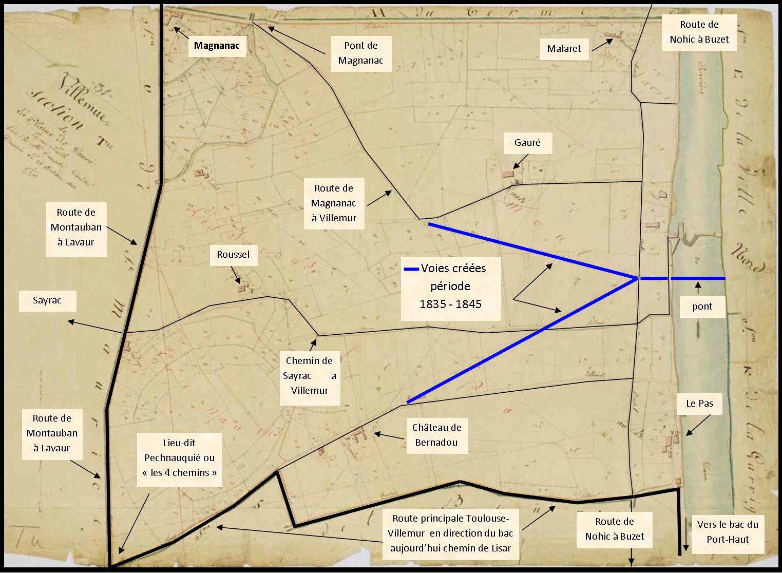 De là partiront en diagonale deux routes : la première (future avenue de Toulouse) rejoindra le carrefour de Pechnauquié et fera la jonction avec la route Villemur –Toulouse par Cépet, plus tard départementale  n°14.
