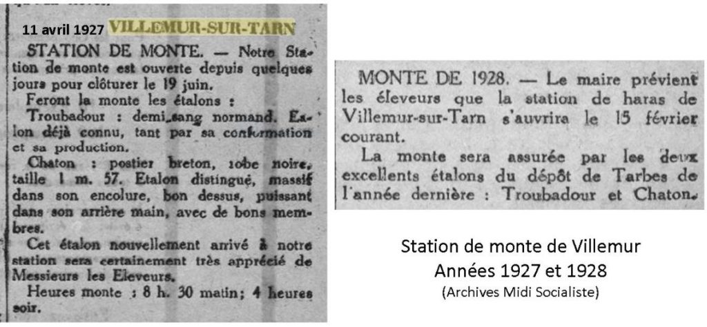 Un vieux projet voit le jour dans les années 1920 avenue de la Gare, (2) avec la création d’une station pour le service de la monte des étalons reproducteurs dont le but est l’amélioration génétique de l’espèce chevaline. Les chevaux utilisés pour « faire la monte » viennent des Haras Nationaux de Tarbes. Inutile de dire que François Valade le maréchal-ferrant tout proche, ne chôme pas, ayant entre autres la charge du cheptel du domaine de Sagnes, propriété des Brusson. L’atelier de Valade, avec le café voisin Pendaries, est le cœur du quartier et un sacré lieu de rencontres !