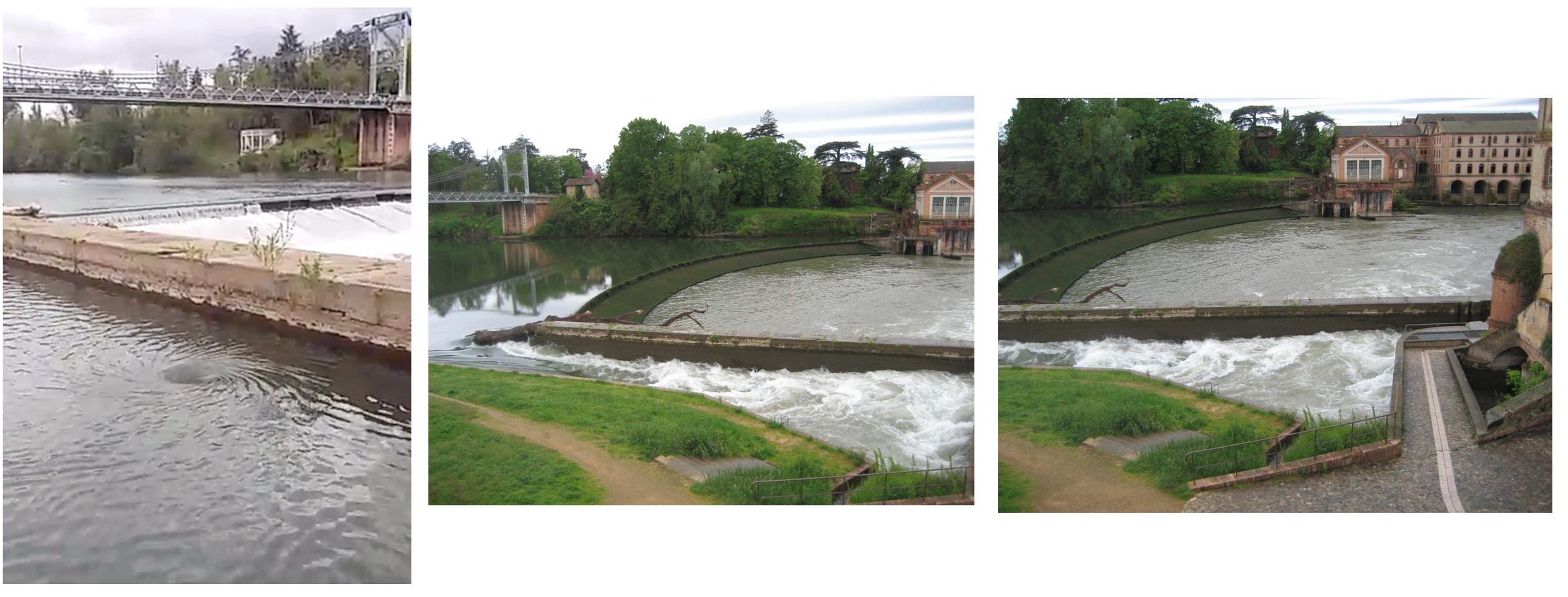 1. à gauche, apparition du siphon à la surface de l’eau. Photos centre et droite : le courant s’engouffre dans l’écluse, la chaussée ne coule plus