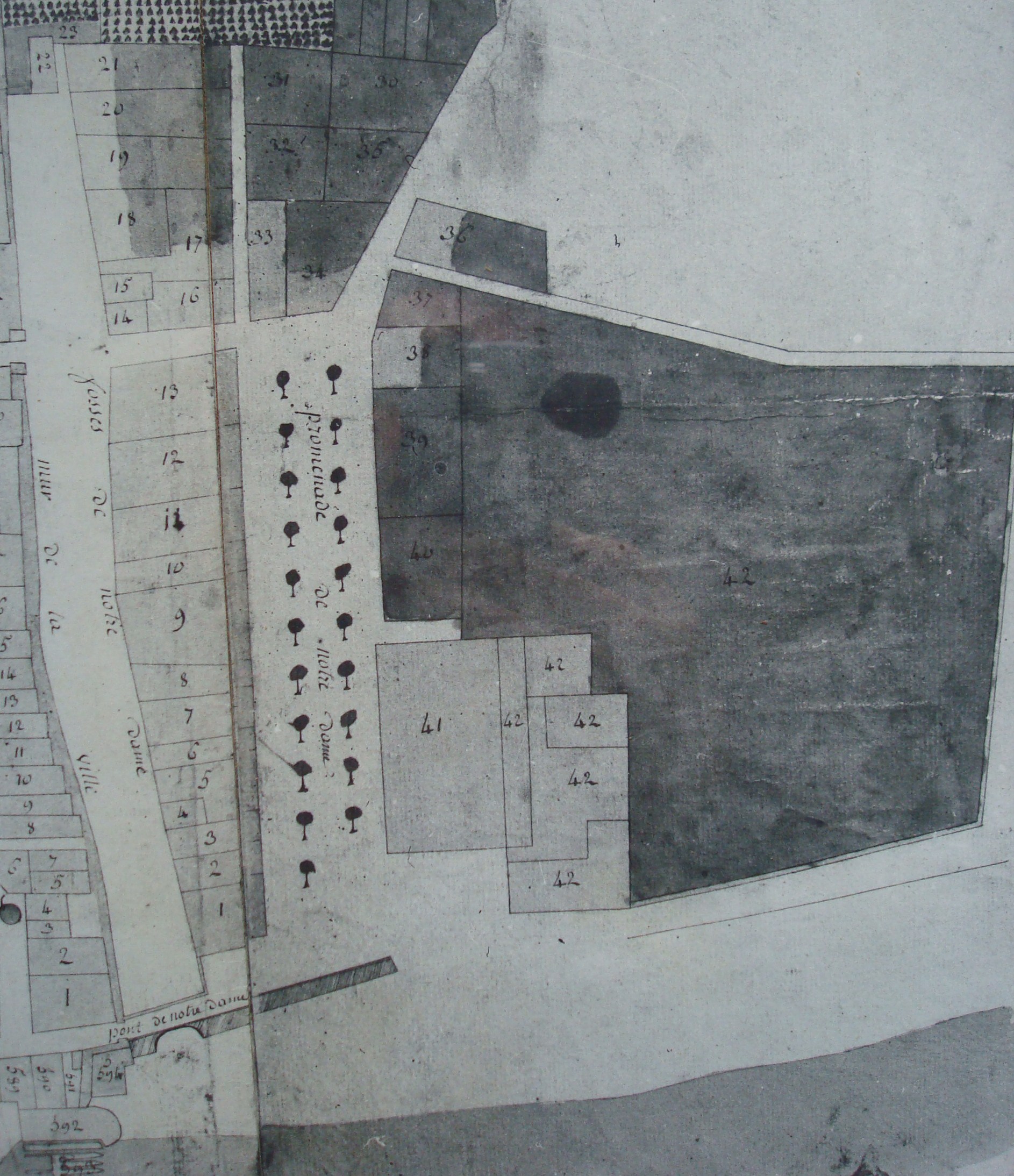 Sur le plan de la ville établi en 1779, tout le côté gauche de la « Promenade de Notre-Dame », c’est ainsi qu’on l’appelle, est construit. L’arrière des maisons donne sur le Fossé Notre-Dame (« le valat », lire balat). La majeure partie du côté droit de la promenade est occupé par quelques jardins sur le haut et surtout par « le magasin à tenir du bois de Monsieur le Vicomte », (Actuellement le Crédit Agricole), un grand bâtiment d’environ 37 mètres de long sur 17 de large, avec un portail à chaque extrémité. Au fond de la place, débouche l’impasse du château qui mène à quelques jardins à flanc de coteau ; c’est aussi l’arrière des maisons – la plupart traversantes – situées sur la place du 4 septembre. Au fond de la place, côté droit, la rue de la côte, appelée aussi « la côte Béziat » qui grimpe vers la Croix de la Peyre. En 1779, si seulement une grange et une maison d’habitation sont répertoriées, tout cet espace entre impasse du château et rue de la côte se couvrira d’habitations à partir du milieu du 19e siècle.