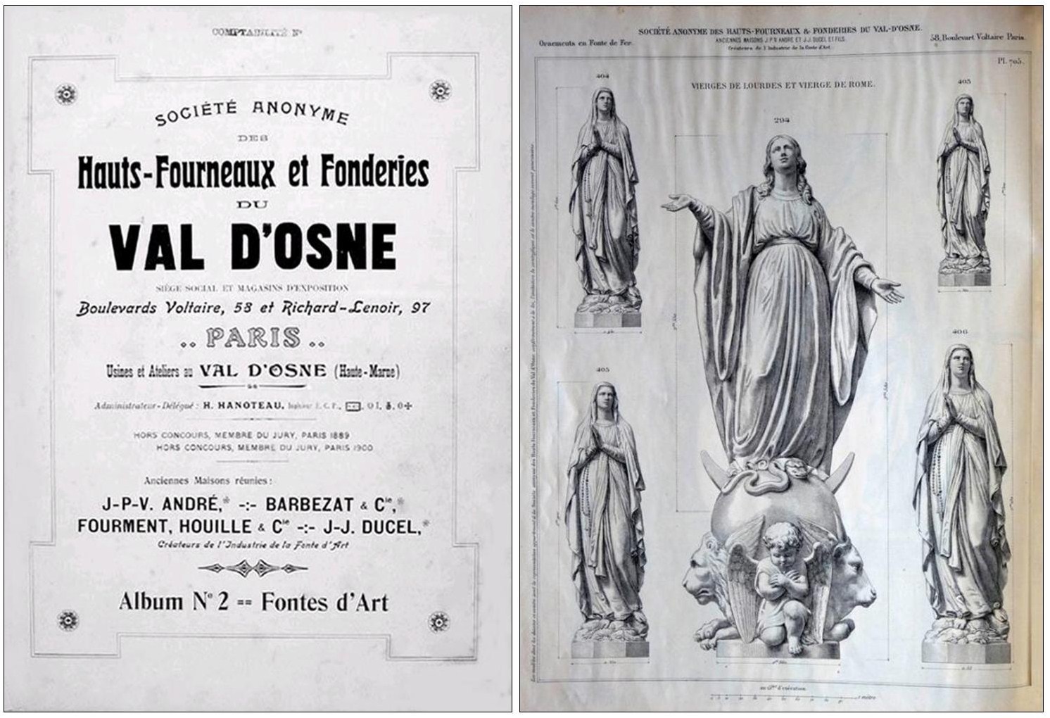 La statue de la Vierge érigée en 1876 est en fonte, provenant des fonderies Fourment Houille et Cie au Val d’Osne dans la Haute-Marne, qui ont racheté en 1867 la société créée à l’origine par Jean-Pierre-Victor André. Le nom de Fourment Houille et Cie – Val d’Osne figure sur une plaque aux pieds de la Vierge. On peut lire sur le côté droit, une autre plaque, abîmée, gravée F(ois) Yarz et Cie à Toulouse. François Yarz tenait un grand établissement de quincaillerie à Toulouse, au 21 de la rue de la Trinité. Il était le revendeur des fontes du Val d’Osne et c’est par son intermédiaire que fut fait l’achat de cette statue.
