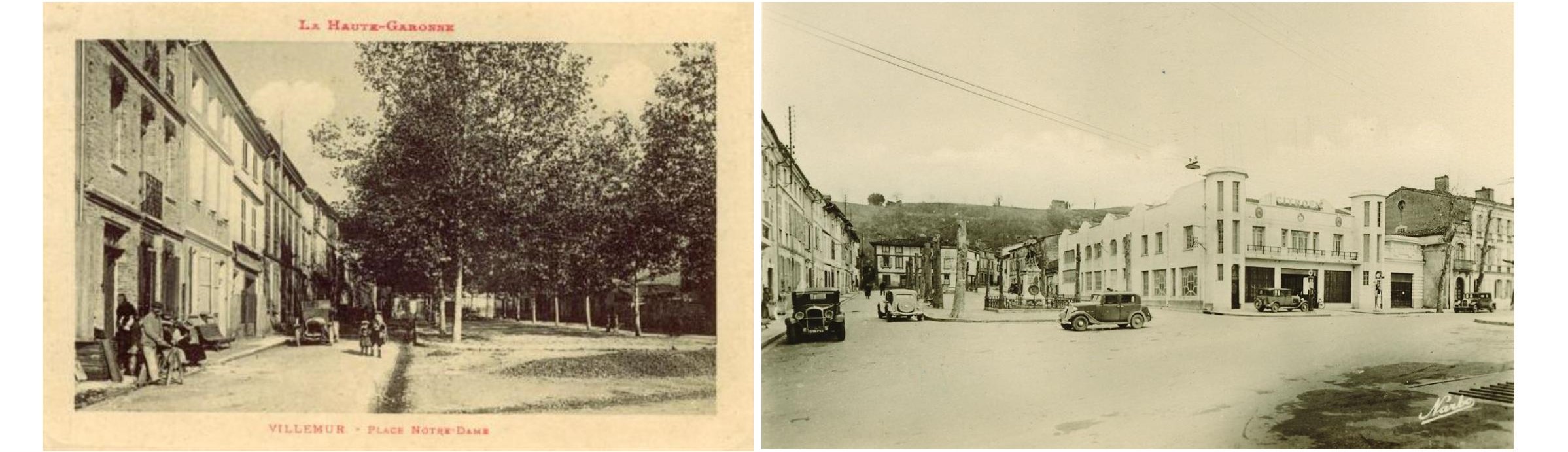 Sur la vue de droite, après les inondations de 1930, la place s’embellit : l’ancienne grange du Vicomte Guy de Ménoire a laissé place au garage moderne où Gustave Defis expose la gamme de ses voitures Citröen.
