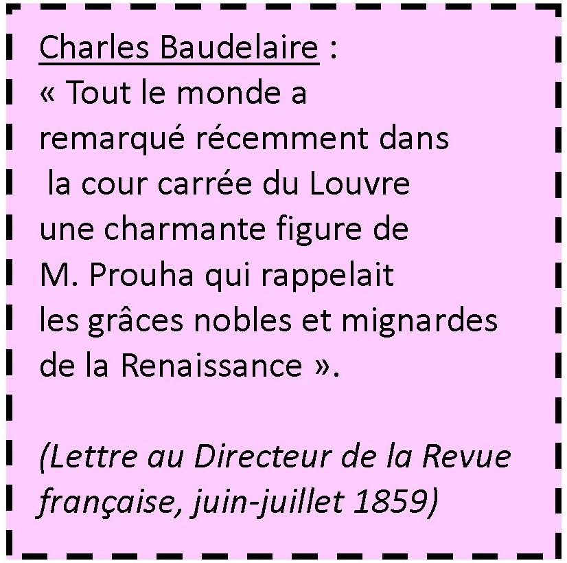 Pierre Bernard Prouha travaille jusqu’à sa mort, le 22 juillet 1888. Le Courrier de l’Art lui rend hommage dans sa rubrique nécrologique : « un des sculpteurs les plus distingués de l’école française », un artiste « merveilleusement doué, d’une intarissable invention ». Appartenant au mouvement artistique du néo-classicisme, il participa également au développement du romantisme. De son premier grand succès en 1851 (Nymphe) jusqu’à sa mort, ce sont plus de 40 œuvres de plâtre, bronze, pierre ou marbre, répertoriées, et c’est sans compter son importante contribution à la restauration du baldaquin de Sainte-Cécile d’Albi (27 statues et anges) ou encore à Notre-Dame de Tongres (2 tympans et 2 statues).