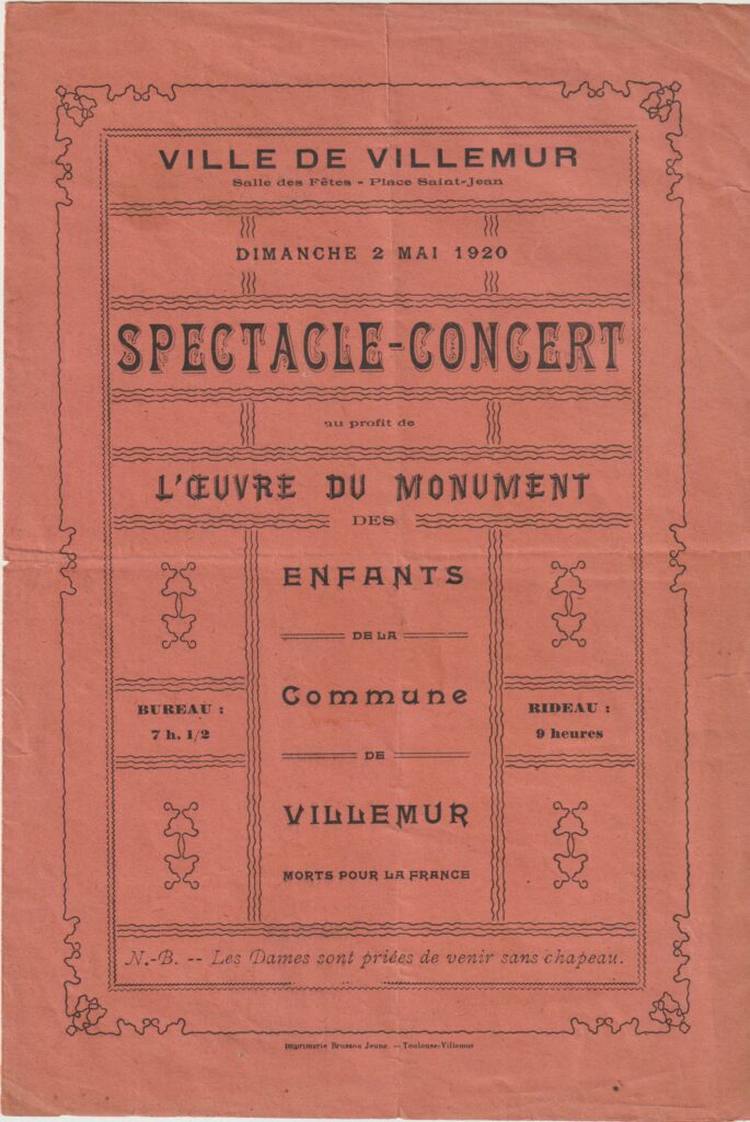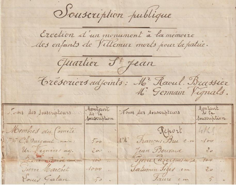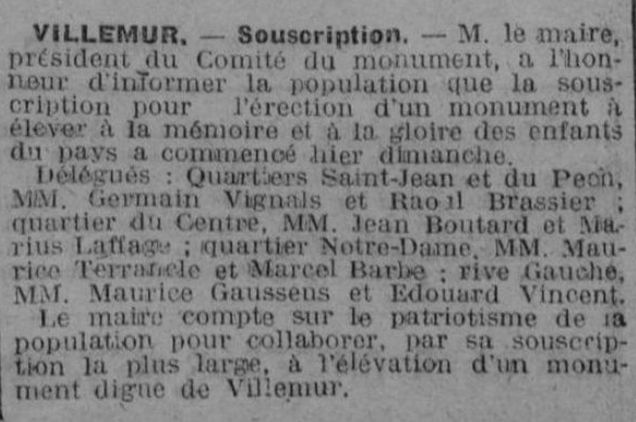 Dans Villemur on s’active : le 15 février 1920 une souscription publique est ouverte auprès de la population. Germain Vignals et Raoul Brassiers sont les délégués du quartier Saint-Jean, Jean Bouvard et Marius Laffage pour celui du Centre, Maurice Terrancle et Marcel Barbe quartier Notre-Dame, Maurice Gaussens et Edouard Vincent pour la rive gauche.