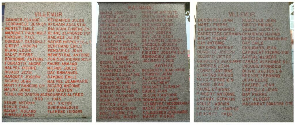 Sur les trois autres faces du socle sont inscrits les 118 noms pour Villemur, Le Terme, Magnanac et Sayrac.